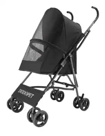 Este coche para mascotas de la marca DODOPET es la solución ideal para pasear a perros pequeños, gatos o mascotas con movilidad reducida con total comodidad y seguridad. Presenta un diseño ligero y plegable en color negro, equipado con una cubierta de malla transpirable que permite una ventilación óptima y una visión panorámica para el animal, además de ruedas dobles frontales que facilitan la maniobrabilidad en distintos tipos de superficie.