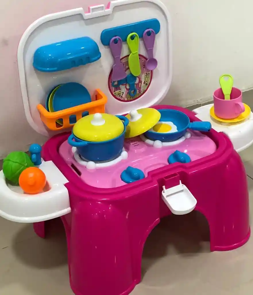 Cocina Asiento 2 En 1 Con Accesorios (funciona con pilas) Juguete practico para que los niños jueguen y se entretengan, recomendado para niños a partir de los 4 años de edad. Con interacción de luz y sonido. Una buena manera de enseñar a los niños a apreciar su comida. Divertido y colorido juego de cocina para cocinar. Está hecha de material de alta calidad y puede autoensamblarse en pasos sencillos siguiendo las ilustraciones del paquete. Tiene luz y sonido que entusiasma a los niños. Requiere 3 baterías AA para funcionar y es adecuado para niños de 3 años en adelante. medida: Alto: 40cm Largo 45cm Ancho 25cm