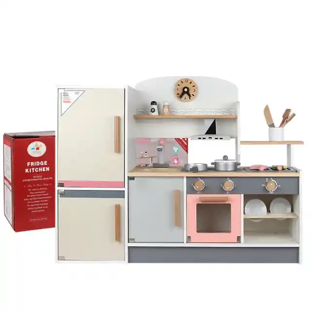 Juguetes de cocina de madera con refrigerador para niños y niñas, juego de cocina de simulación, experiencia de cocina, regalos