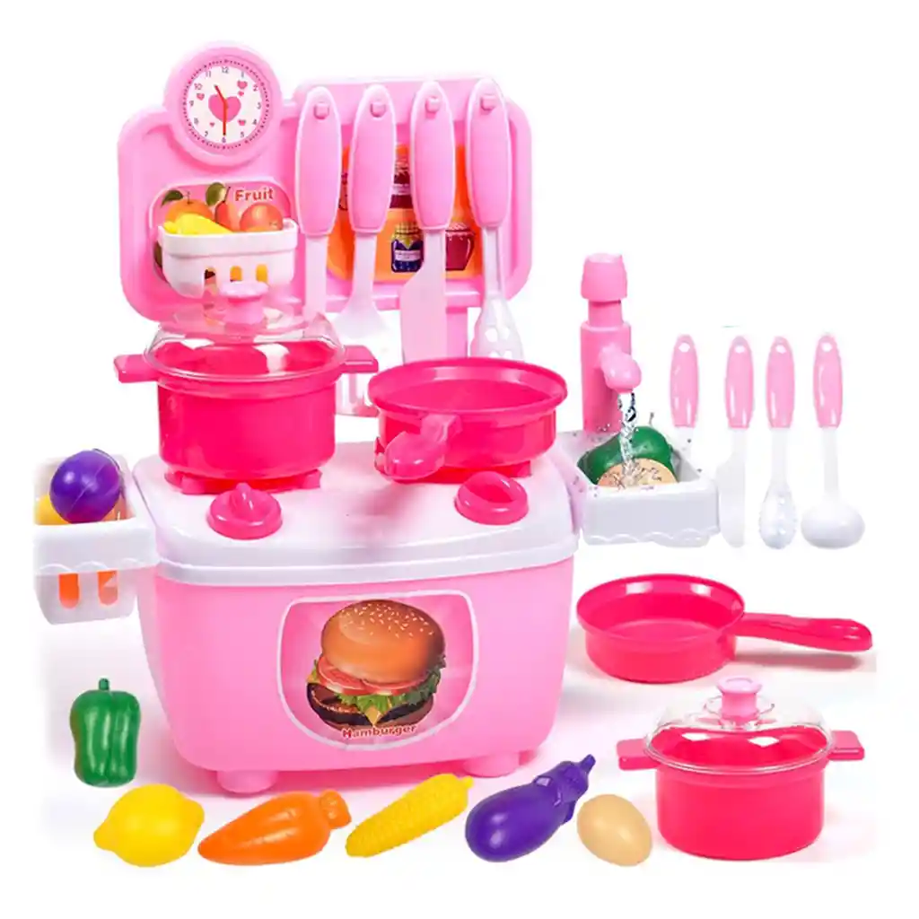 Sistema de agua real!Set de cocina, con ollas, sartenes y más acessorios, es fácil de montar, seguro, y mantiene entretenidas durante muchas horas a las pequeñas divertiéndose!.La cocina tiene estufa y multiples accesorios: ollas, sartenes, y cubiertos para el juego realista!Características: • Mecanismo que bombea el agua del lavaplatos por la llave o grifo• Resistente al agua.• No requiere baterías• Este set de cocina incluye ollas, sartenes, utensilios de cocina, comida de juguete y mucho más! 18 piezas en total. • Dimensiones caja(18.5*19*12)cm• Dimensiones de la cocina 27cm de alto * 26 cm de largo * 12cm de ancho.