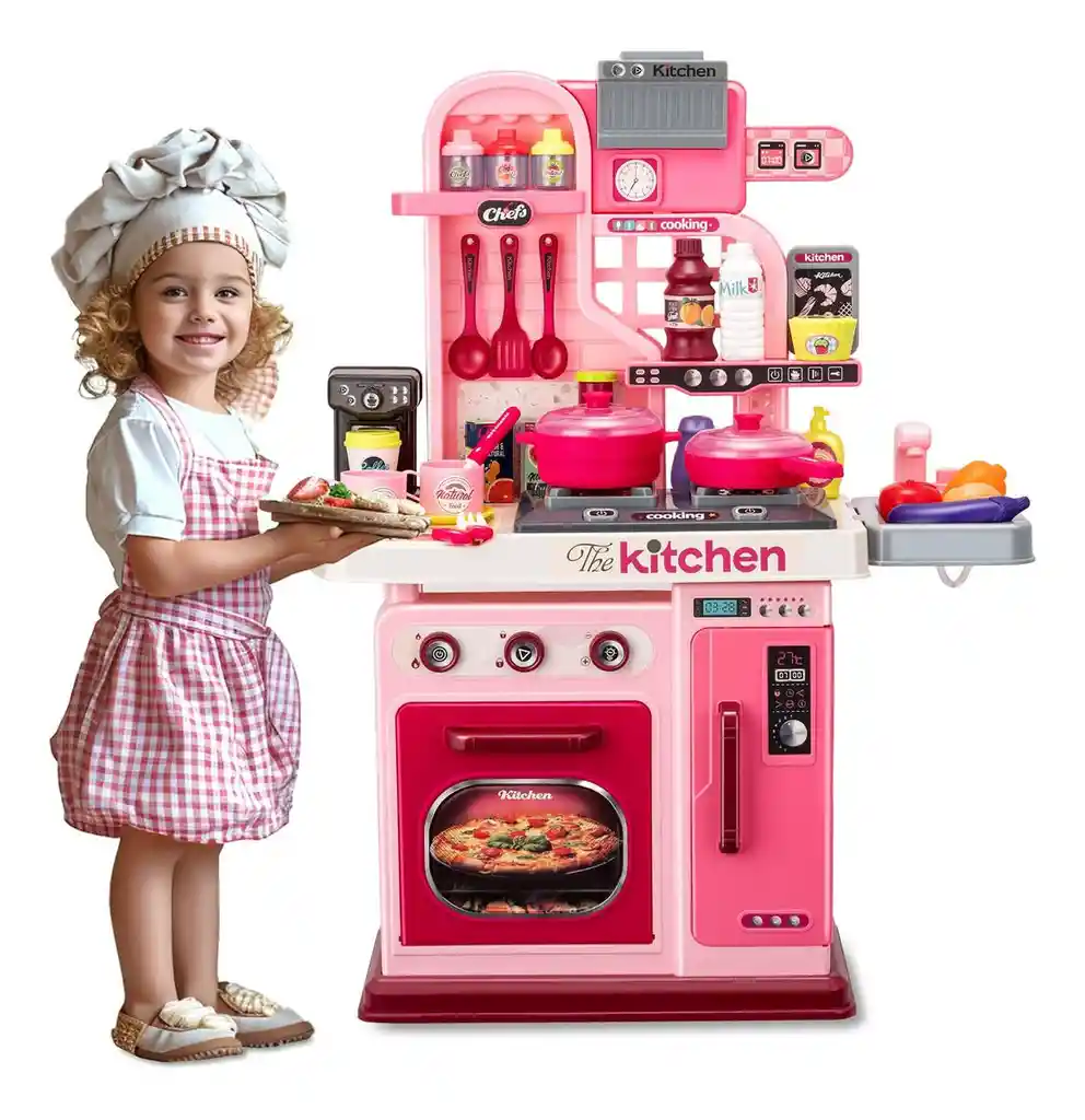 cocina de juguete interactiva , modelo 008-969. Entre las que se encuentran ollas, sartenes, utensilios y alimentos de juguete. Funciones: Cuenta con efectos de luces y sonidos realistas al encender los quemadores, además de un grifo funcional con circulación de agua real. Diseño: Está fabricada en plástico de alta calidad de color rosa y cuenta con horno y nevera simulados. Dimensiones: Aprox 53times 22times 69 cm