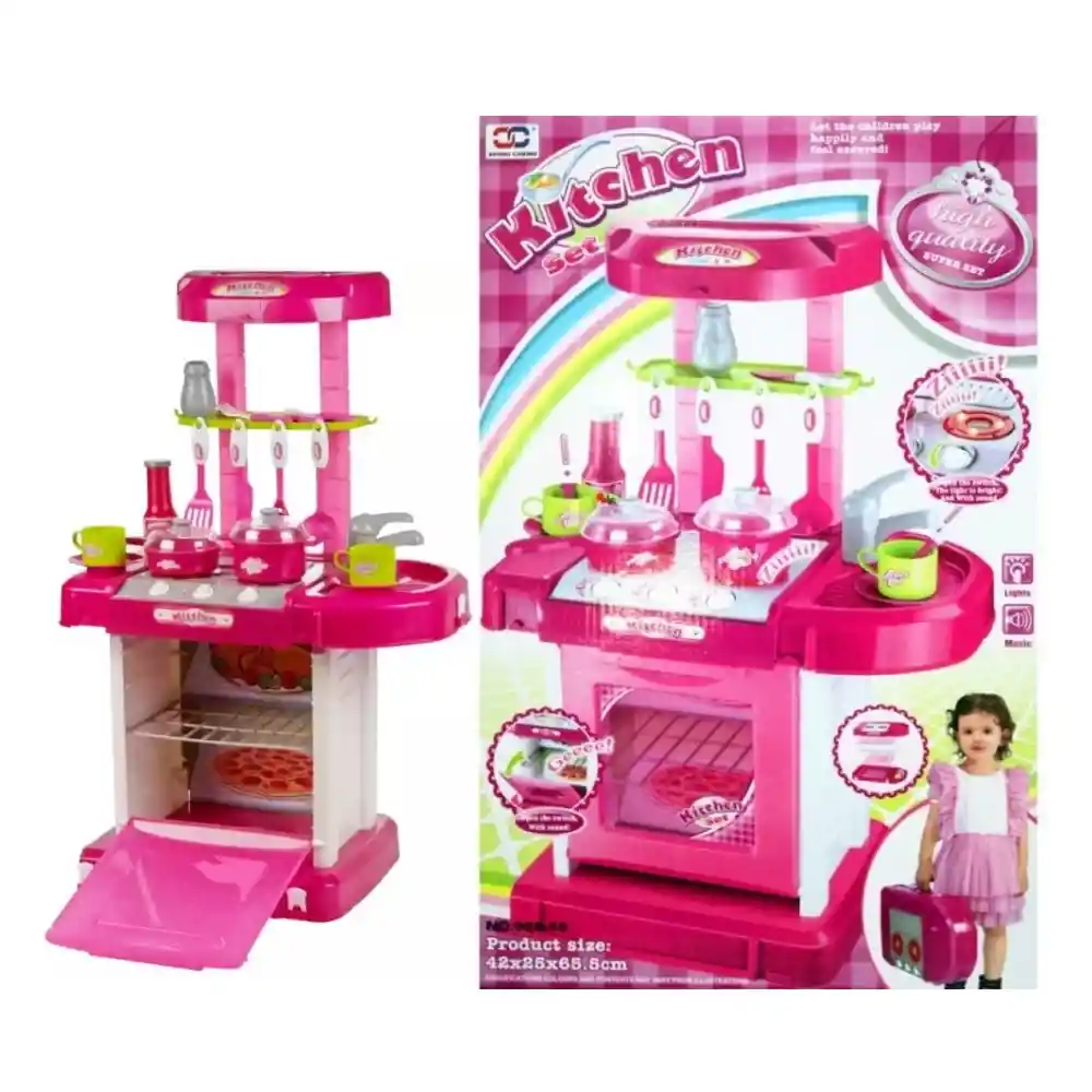 Es una cocinita de juguete de color rosa, diseñada para el juego de imitación. Incluye una estructura tipo cocina completa con estufa, horno y repisa superior. Viene acompañada de accesorios de cocina como ollas, sartenes, cucharones, espátulas y tazas. El horno cuenta con puerta abatible, y la estufa simula zonas de cocción. Algunos modelos incorporan luces y sonidos para hacer el juego más realista. Está fabricada en plástico resistente, con bordes redondeados para mayor seguridad.