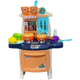 ADVERTENCIA: Este producto puede contener piezas pequeñas. que representen riesgo de asfixia. Se sugiere supervisión de un adulto.Juguete para niños en forma de equipos de cocina:cocina con 2 hornos. ollas y tapas. vidrio. diversos tipos de cucharas.cuchillos. tenedores. cucharas de sopa. botellas de salsa.botellas de condimentos. el grifo y el fregadero de la cocina estante.Figura pollo y hornear pizza.El uso de 3 baterías AA. 1.5 V (no incluido)La estufa puede ser encendido. y el sonido como una cocción más largo.La puerta del horno se puede abrir y puede emitir sonidos también .Medias alto 47cm - largo 37cm -ancho 23 cm.
