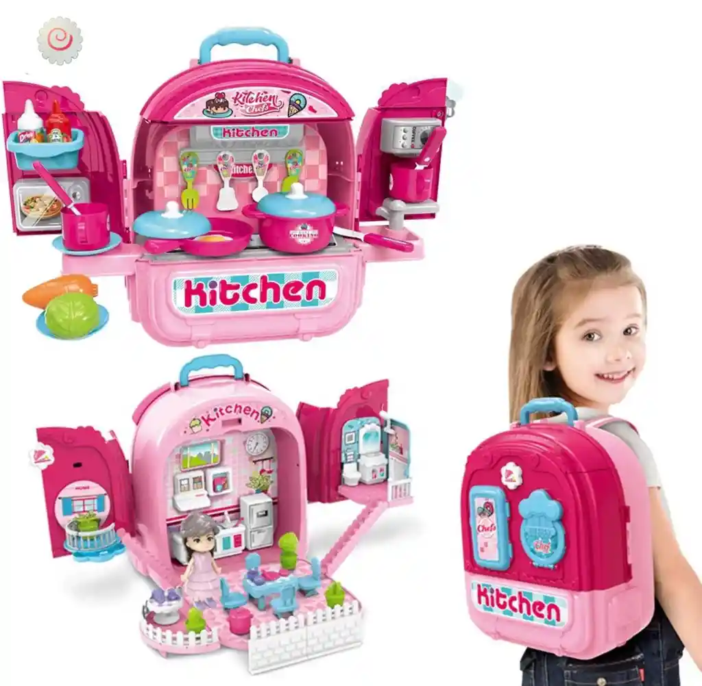 Abre la mochila para descubrir un mundo en miniatura de maravillas culinarias. Los juguetes de cocina a escala permiten a los pequeños chefs crear sus propias obras maestras en cualquier lugar. Con juguetes de cocina surtidos y una adorable muñequita chef, cada día se convierte en una nueva aventura culinaria. Edad: 3+ Set de maleta cocina 3 en 1, cuenta con diferentes accesorios, tambien incluye set de muñecas y casita. Esta elbarorada en plastico rigido y correas de tela rigida