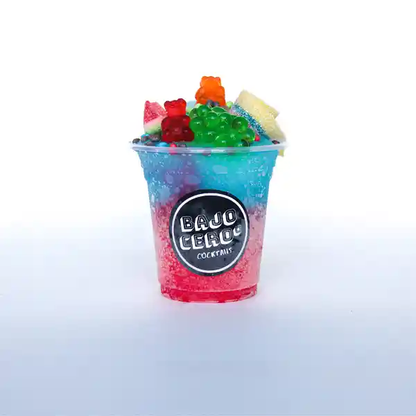 Cocktail granizado pequeño combinado de Red Kiss con Blue Moon. Con toppings de gomitas como gummy bear sandía y bandera ácida base de juicy perlas explosivas y nerds.