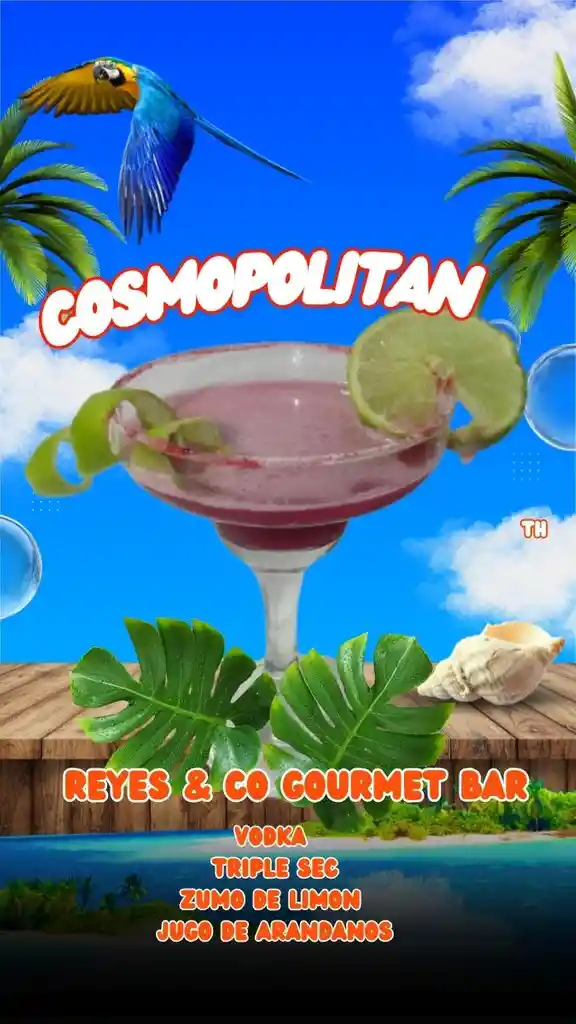 Cosmopolitan preparado con vodka, triple sec, zumo de limón y jugo de arándanos, servido frío y decorado con rodajas de limón. Disfruta el cóctel que combina frescura y sabor frutal, ideal para cualquier ocasión en Reyes & Co Gourmet Bar.