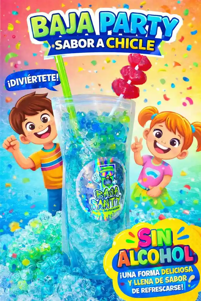 coctel granizado sin alcohol sabor a chicle, incluye perlas explosivas, paleta y divertidos y deliciosas gomitas