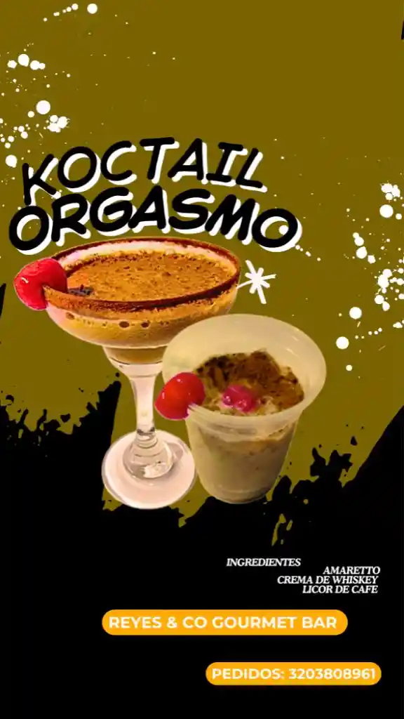 Cóctel Orgasmo: mezcla intensa de amaretto, crema de whiskey y licor de café, servido frío y decorado. ¡Disfruta una explosión de sabor única en Reyes & Co Gourmet Bar!