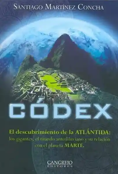 En Códex. Santiago Martínez Concha nos revela algunos de los hallazgos más escalofriantes de todos los tiempos Sus estudios pueden centrarse en cinco campos principales: 1. La cultura antediluviana de los Nefilim. 2. La descripción del lugar puntual en que se encuentra escondido el Tesoro del Dorado. 3. El descubrimiento de la Atlántida. 4. El desciframiento de los monumentos de Stonehenge en Escocia y el lugar donde está escondido el código del origen de la vida en la Península de Lisán en Israel y 5. La extraña relación que existe entre la cultura Atlante y el planeta Marte.