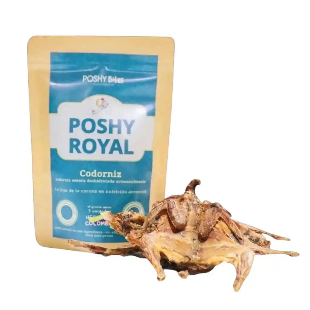 Tu peludito también merece algo natural. El lujo de la nutrición ancestral. POSHY ROYAL trae la exquisitez de la codorniz deshidratada, una proteína magra, altamente digestible y poco convencional, ideal para mascotas con sensibilidades alimentarias o paladares de la realeza. Rica en vitaminas del grupo B y minerales esenciales, es la máxima expresión de exclusividad en el mundo de los snacks. Beneficio Clave: Hipoalergénico y alta palatabilidad. Origen: Fabricación Local Colombiana Ingredientes: 100% Codorniz Presentación: Doypack con cierre hermético para máxima frescura. Uso: Complemento alimenticio / Premio. Peso: 3 unidades Registro ICA: 01387002025