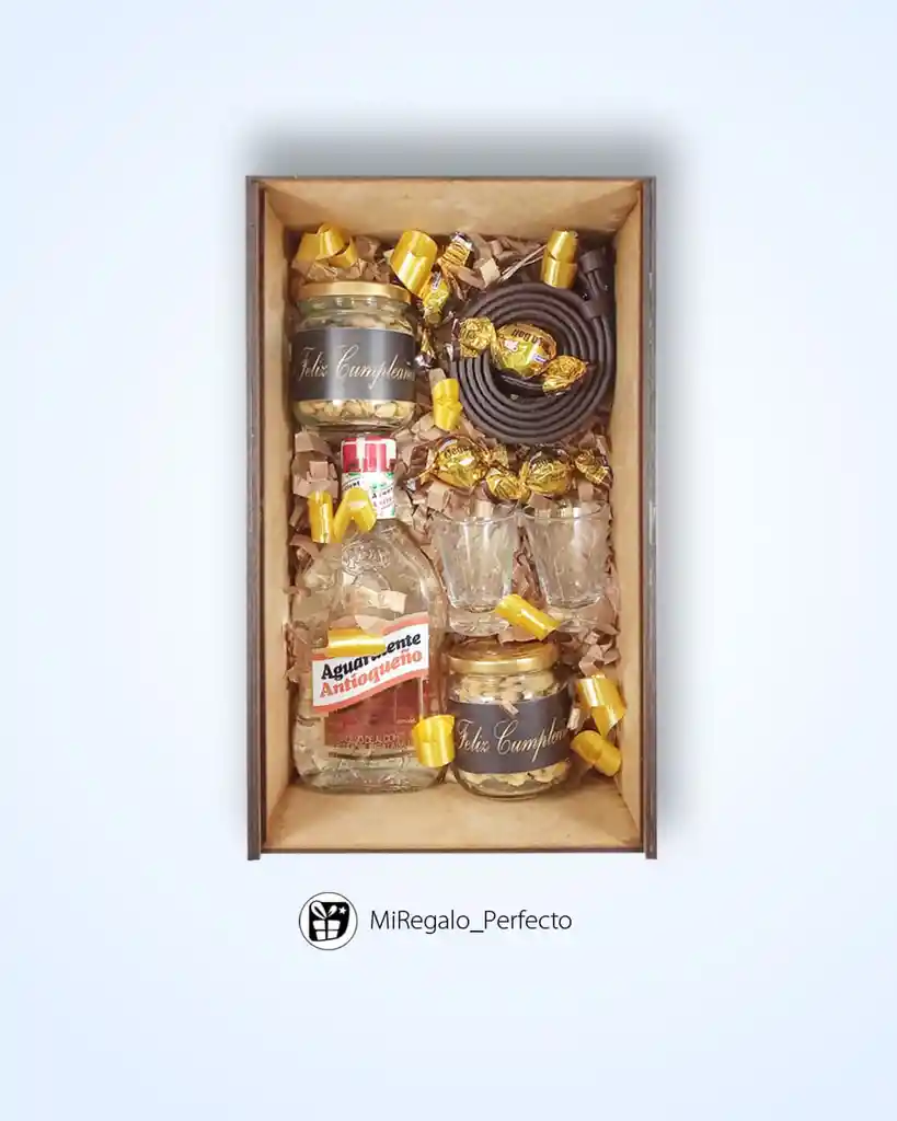 Regalo En Cofre De Madera, Con Media De Guaro, 2 Copas De Cristal, 2 Botellitas De Cristal Con Frutos Secos, Chocolates Burbujas De Edición Limitada. X4 Y Correa En Cuero De Vélez. Te Incluye Toda Su Decoración A Temática Con Cintas Y Moños, Adhesivos Y Tarjeta Personalizada. . .. .