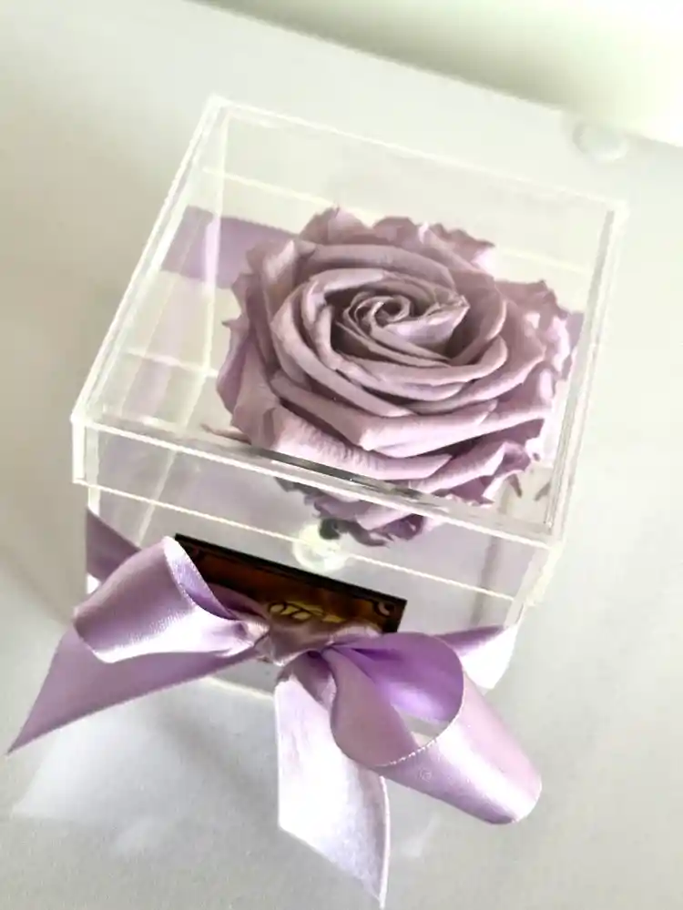 Hermoso cofre pqueño 9 x9 x 9 con rosa rosada premium preservada natural, durabilidad ano y medio, en cofre de acrílico. Dia de la mujer. incluye; bolsita de Presentación