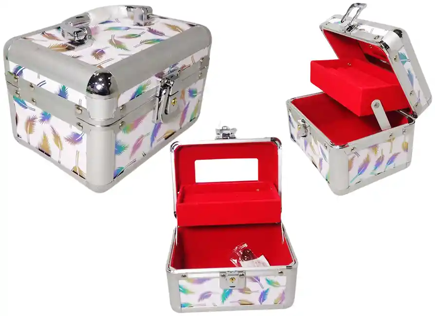 Somos Inversiones MAZUGI CAJA PORTA MAQUILLAJES O JOYERO PARA MUJER MEDIANO Hecha de metal y cuero sintético El exterior es de color plateado El interior es color rojo Sirve para decorar Diseño de plumas Incluye 1 espejo en el interior Regalo perfecto para una dama en el día de amor y amistad Medidas de la caja Alto: 10cm Largo: 15cm Ancho: 11cm Presentación en caja