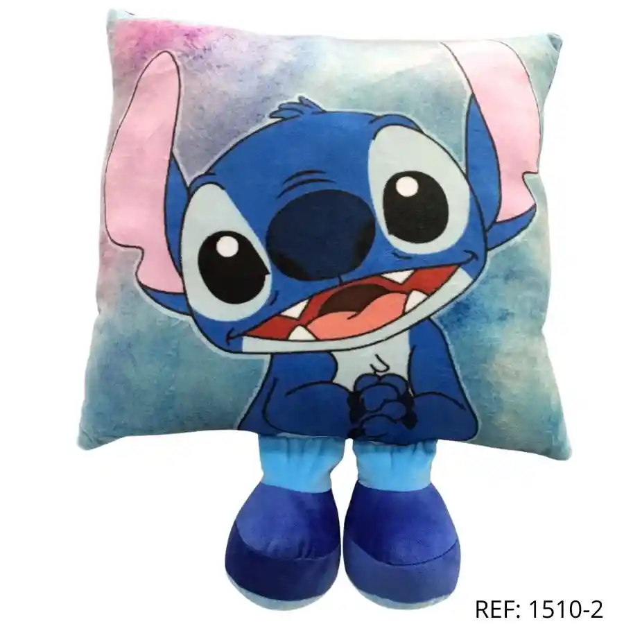 Cojín azul con figura de Stitch, con piernas acolchadas. Perfecto para fans y decoración divertida.