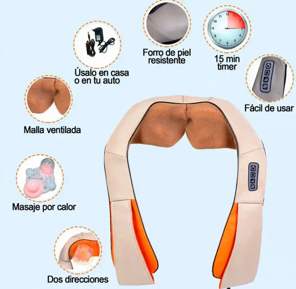 Especificaciones principales •Características : Masajeador Corporal Hombros Cuello Cintura Espalda Electrico Calor Modelo cuello masaje Número de rodillos: 16. Direcciones de masaje: Derecha e izquierda. Con opción de activar calor. Material: Malla y piel sintetica. PU+ABSCuenta con 3 niveles de intensidad: bajo, medio o alto. Los grados de intensidad se ajustan al tipo de molestia que se presente, puede comenzar por el más nivel más bajo y después aumentarlo o dejarlo en un solo nivel. Debe estra conectado a la corriente para su funcionamiento.Potencia nominal: 50HZ •Uso : Para cuerpo ayuda a aliviar la tensión muscular, la rigidez de cuello y mejora la circulación, liberan la presión sobre los hombros y el cuello y brindarle una experiencia cómoda. •Voltaje : 12 V •Recomendaciones : No exponga al fuego Ni al aguaEste producto debe ser manipulado solo por un adultoLimpie el producto después de su usoLimpiar con un paño humedo.Siempre use el soporte de mano para evitar accidentes Puede haber alguna diferencia de tono entre la imagen y el producto real, debido al tratamiento de la imagen y la calibración del color de su monitor.