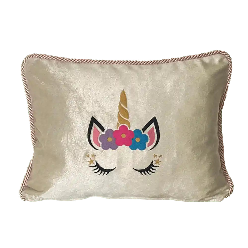 Cojin crema en velvet, medida 50x36 con diseño unicornio estrellas, cierre con cremallera para fácil limpieza.