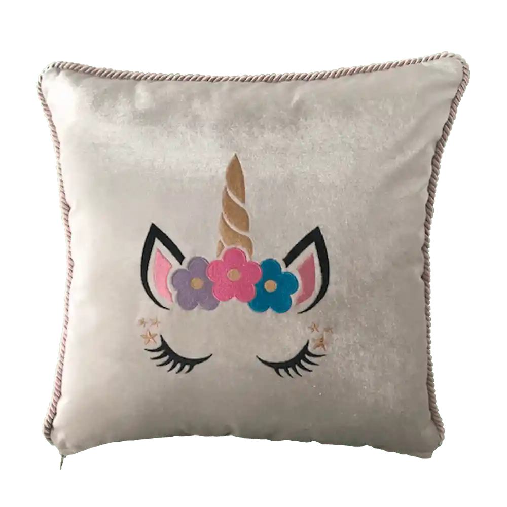 Cojin crema en velvet, medida 50x50 con diseño unicornio estrellas, cierre con cremallera para fácil limpieza.