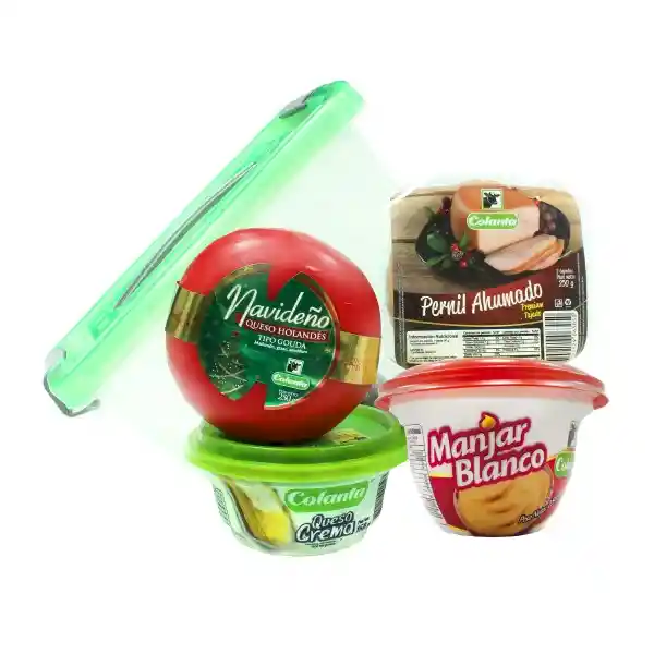 Contiene 5 Unidades. Queso 250 g + Queso Crema 260 g + Arequipe 1 Und + Pernil Ahumado 250 g + Taza 1 Und.