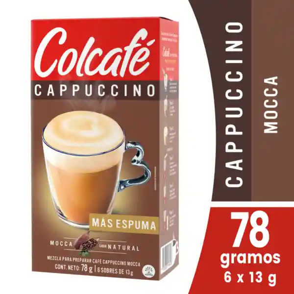 Espumoso, delicioso y fácil de preparar, así es el Colcafé cappuccino, que ahora viene con sabor a mocca, menos azúcar y más espuma. Disfrútalo solo o en compañía de quien más quieres. Caja por 6 sobres de 13 g cada uno.