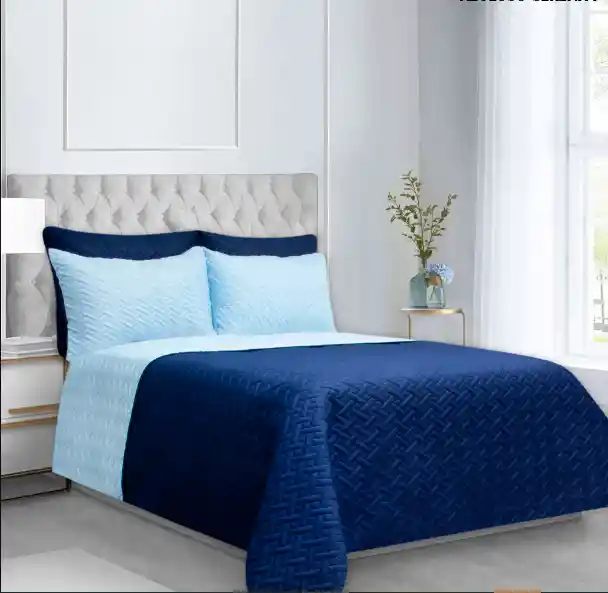 Colcha Doble Faz Fiore Azul Rey – Azul Claro para Cama Sencilla (100 X 190 cm). Colcha Doble Faz, prensado con termosellado Incluye: 2 piezas: Una (1) colcha de ( 170 X 240 cm) Una (1) funda de almohada ( 50 X 75 cm) Material: Exterior: Microfibra 100% Poliéster Relleno: Fibra Siliconada. Empaque: Ancho: 35 cm Largo: 53 cm Alto: 21 cm Peso: 1900 Cuidados: No usar detergente con blanqueador No dejar en remojo, ni cepille Lavar con prendas de igual tono En máquina, lavar en ciclo suave Secar a la sombra o máquina en el ciclo de planchado