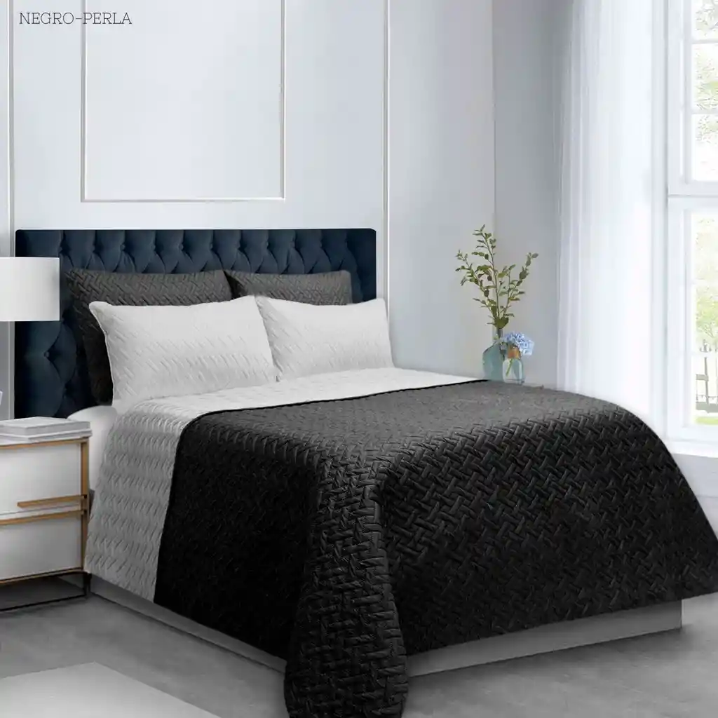Colcha Doble Faz Fiore Negro - Gris para Cama Doble (140 X 190 cm). Colcha Doble Faz, prensado con termosellado Incluye: 3 piezas: Una (1) colcha de ( 215 X 240 cm) Dos (2) fundas de almohada ( 50 X 75 cm) Material: Exterior: Microfibra 100% Poliéster Relleno: Fibra Siliconada. Empaque: Ancho: 40 cm Largo: 49 cm Alto: 15 cm Peso: 2100 Cuidados: No usar detergente con blanqueador No dejar en remojo, ni cepille Lavar con prendas de igual tono En máquina, lavar en ciclo suave Secar a la sombra o máquina en el ciclo de planchado
