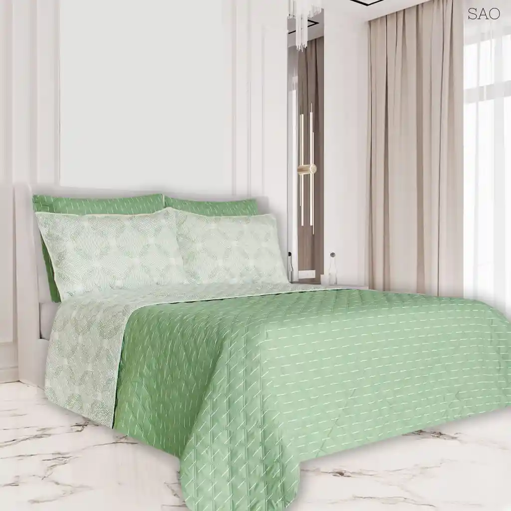 Colcha Doble Faz Ragazza Sao para Cama Doble (140 X 190 cm) Lado 1 Fondo Blanco Rayas Verdes Lado 2 Fondo Verde Rayas Discontinuas Blancas Debido a la luz y a la diferencia de características técnicas de las pantallas, el color del artículo puede ser ligeramente diferente al de las imágenes. Colcha Doble Faz, prensado con termosellado Incluye: 3 piezas: Una (1) colcha de ( 215 X 240 cm) Dos (2) fundas de almohada ( 50 X 75 cm) Material: Exterior: Microfibra 100% Poliéster Relleno: Fibra Siliconada. Empaque: Ancho: 40 cm Largo: 49 cm Alto: 15 cm Peso: 2100 Cuidados: No usar detergente con blanqueador No dejar en remojo, ni cepille Lavar con prendas de igual tono En máquina, lavar en ciclo suave Secar a la sombra o máquina en el ciclo de planchado