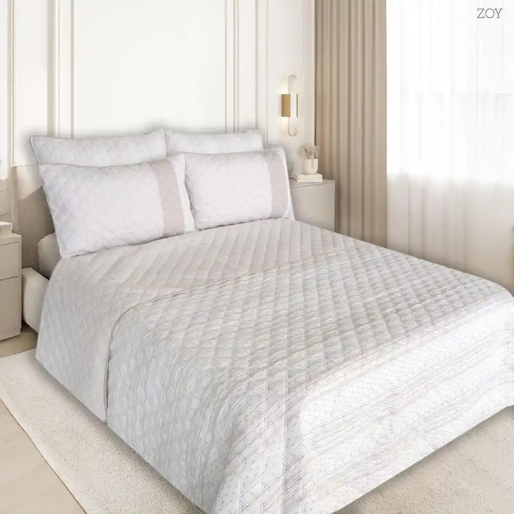 Colcha Doble Faz Ragazza Zoy para Cama Sencilla (100 X 190 cm) Lado 1 Fondo Beige Claro Rayas Pequeñas Cafés Lado 2 Fondo Beige Figuras Arabescos. Colcha Doble Faz, prensado con termosellado Incluye: 2 piezas: Un (1) Sobre Cama ( 170 X 240 cm) Una (1) funda de almohada ( 50 X 75 cm) Material: Exterior: Microfibra 100% Poliéster Relleno: Fibra Siliconada. Empaque: Ancho: 36 cm Largo: 46 cm Alto: 12 cm Peso: 1500 Cuidados: No usar detergente con blanqueador No dejar en remojo, ni cepille Lavar con prendas de igual tono En máquina, lavar en ciclo suave Secar a la sombra o máquina en el ciclo de planchado