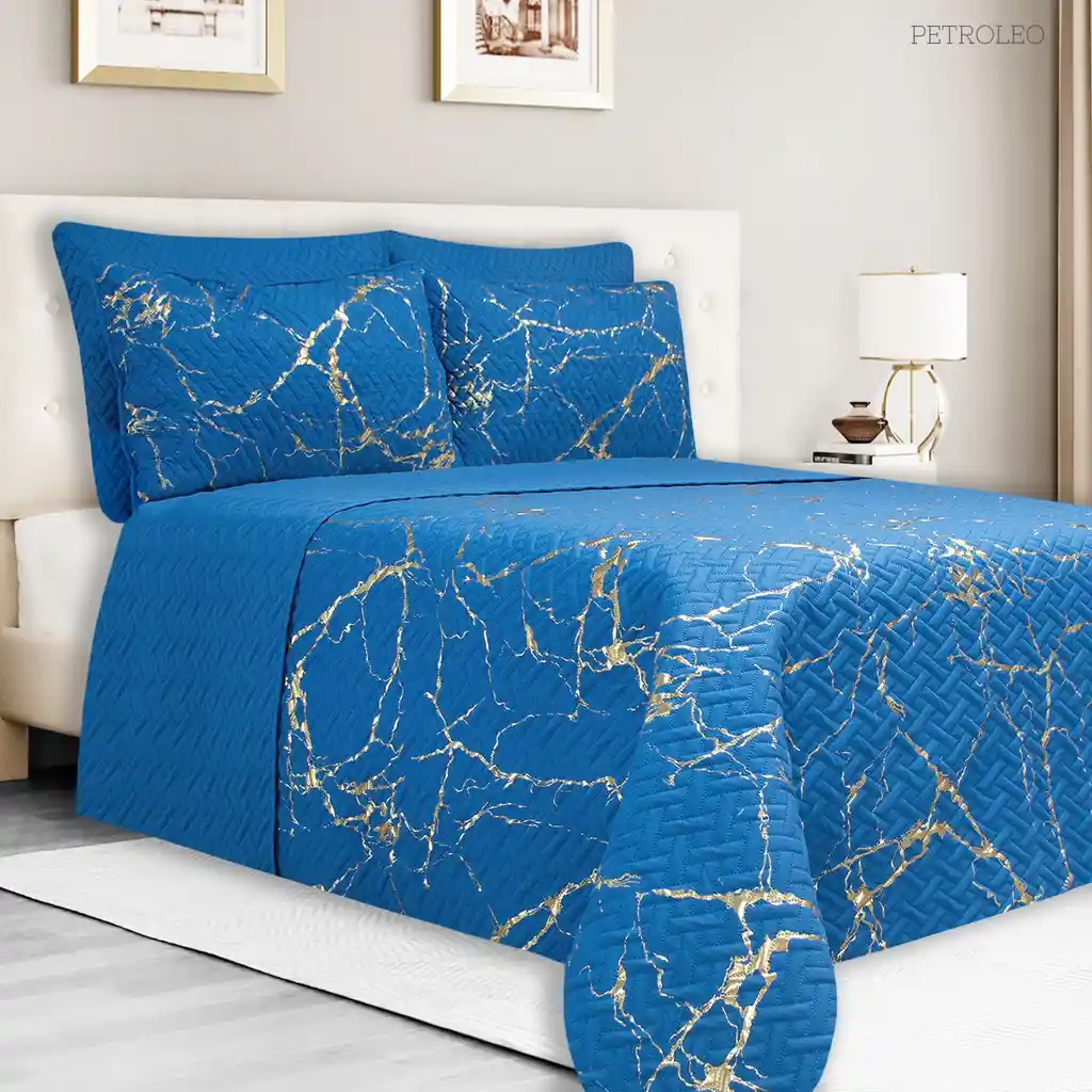 Colcha Gaudi Microfibra Doble Faz Unicolor Azul Petróleo para Cama Doble efecto dorado para Cama Doble (140 X 190 cm). Colcha Doble Faz, prensado con termosellado con aplique color dorado. Incluye: 3 piezas: Una colcha de ( 215 X 240 cm) con aplique color dorado. Dos fundas de almohada ( 50 X 75 cm) Material: Microfibra 100% Poliéster Cuidados: No usar detergente con blanqueador No dejar en remojo, ni cepille Lavar con prendas de igual tono En máquina, lavar en ciclo suave Secar a la sombra o máquina en el ciclo de planchado Empaque: Ancho: 42 cm Largo: 49 cm Alto: 10 cm Peso: 2100