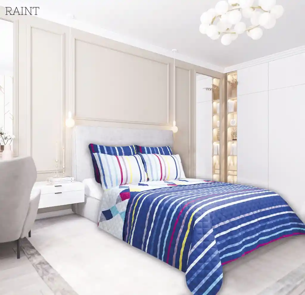 Colcha Ragazza Doble Faz Estampada Raint para Cama Doble (140 X 190 cm). Colcha Doble Faz, prensado con termosellado Lado 1 Fondo Azul rey, rayas de colores Lado 2 Fondo Blanco Figuras de colores Incluye: 3 piezas: Una colcha de ( 215 X 240 cm) Dos fundas de almohada ( 50 X 75 cm) Material: Exterior: Microfibra 100% Poliéster Relleno: Fibra Siliconada. Cuidados: No usar detergente con blanqueador No dejar en remojo, ni cepille Lavar con prendas de igual tono En máquina, lavar en ciclo suave Secar a la sombra o máquina en el ciclo de planchado
