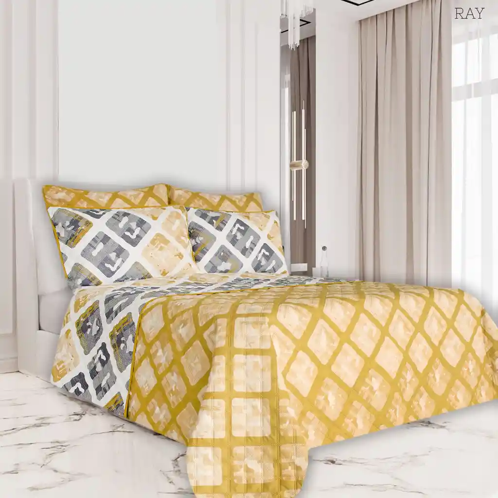 Colcha Ragazza Doble Faz Estampada Ray para Cama King (200 X 200 cm). Lado 1 Fondo Blanco Cuadros Gris Lado 2 Fondo Mostaza Cuadricula Colcha Doble Faz, prensado con termosellado. Incluye: 3 piezas: Un (1) colcha de ( 2700 X 240 cm) Dos (2) fundas de almohada ( 50 X 75 cm) Material: Exterior: Microfibra 100% Poliéster Relleno: Fibra Siliconada. Color: Colores Rayas Moderno Azul Ray Medidas de empaque: Ancho: 40 cm Largo: 49 cm Alto: 15 cm Peso: 2300 Cuidados: No usar detergente con blanqueador No dejar en remojo, ni cepille Lavar con prendas de igual tono En máquina, lavar en ciclo suave Secar a la sombra o máquina en el ciclo de planchado