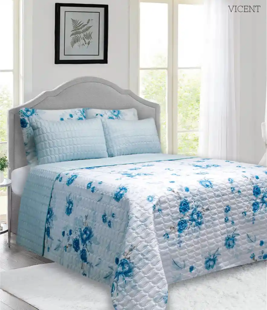 Colcha Ragazza Doble Faz Estampada Vicent para Cama Sencilla (100 X 190 cm). Color Azul Claro por un lado, Floral Azul por el otro. Colcha Doble Faz, prensado con termosellado. Incluye: 2 piezas: Un (1) colcha de ( 170 X 240 cm) Un (1) fundas de almohada ( 50 X 75 cm) Material: Exterior: Microfibra 100% Poliéster Relleno: Fibra Siliconada. Empaque: Ancho: 42 cm Largo: 49 cm Alto: 10 cm Peso: 1500 Cuidados: No usar detergente con blanqueador No dejar en remojo, ni cepille Lavar con prendas de igual tono En máquina, lavar en ciclo suave Secar a la sombra o máquina en el ciclo de planchado