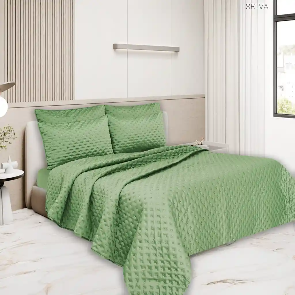 Colcha 100% poliéster de alta calidad proporciona una sensación de suavidad, confort y elegancia. Para Cama Doble. Nota el color puede variar al producto físico debido a resoluciones de las pantallas donde lo mire Prensado con termosellado Incluye: 3 piezas: Una (1) colcha de (215 X 240 cm) Dos (2) fundas de almohada (50 X 75 cm) Material: Exterior: 100% Poliéster Medidas de empaque: Ancho: 40 cm Largo: 49 cm Alto: 15 cm Peso: 2300 Cuidados: Utiliza Agua Fría Usar Jabón para ropa delicada No usar detergente con blanqueador No dejar en remojo, ni cepille, no frote. Lavar con prendas de igual tono En máquina, lavar en ciclo suave Secar a la sombra o máquina en el ciclo de planchado No secadora No mascotas