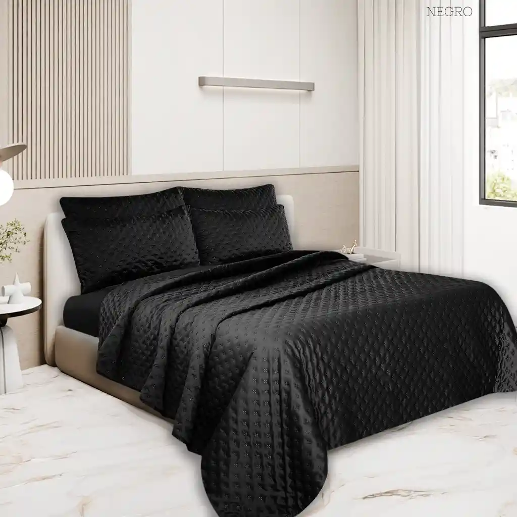 Colcha 100% poliéster de alta calidad proporciona una sensación de suavidad, confort y elegancia. Para Cama Doble. Nota el color puede variar al producto físico debido a resoluciones de las pantallas donde lo mire Prensado con termosellado Incluye: 3 piezas: Una (1) colcha de (215 X 240 cm) Dos (2) fundas de almohada (50 X 75 cm) Material: Exterior: 100% Poliéster Medidas de empaque: Ancho: 40 cm Largo: 49 cm Alto: 15 cm Peso: 2300 Cuidados: Utiliza Agua Fría Usar Jabón para ropa delicada No usar detergente con blanqueador No dejar en remojo, ni cepille, no frote. Lavar con prendas de igual tono En máquina, lavar en ciclo suave Secar a la sombra o máquina en el ciclo de planchado No secadora No mascotas