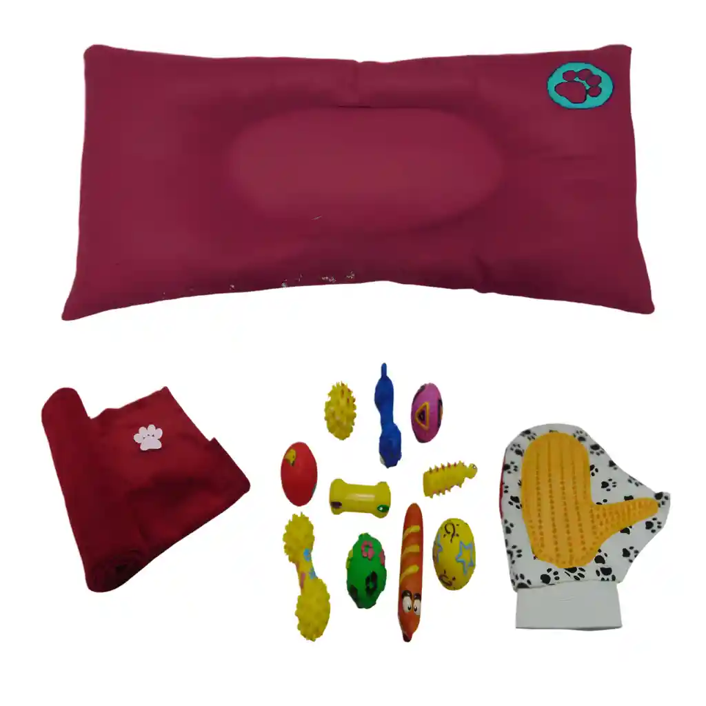 Bienvenido somos HallyPet, tu mejor aliado para el cuidado de tu hijo Perruno y/o Gatuno. CONTENIDO: 1 Colchon huella bordad 1 Cobija mediana 1 Guante 1 Juguetes Blandos Colchón Premium Pequeño Huella Bordada con cubierta lavable extraíble. Características del producto: • La cama colchón incluye funda con relleno siliconado y adicional su funda en fleece extraíble para su lavado. • Medidas Largo 67 cm Ancho 40 cm Alto 9 cm • Huella Bordad en una esquina del colchón. • Material: Fleece Resistente a Rasguños • Suave, consistencia de apoyo según el peso y la presión para aliviar articulaciones, artritis o displasia de cadera. • Funda extraíble y lavable a máquina: la funda con cremallera es fácil de limpiar y lavar en un ciclo suave para mejor higiene., apto para secadora GUANTE CEPILLO PARA PERROS Y/O GATOS El cepillado es la base fundamental para el cuidado del pelaje canino, si lo haces frecuentemente eliminarás hasta el 50% de la suciedad y el pelo muerto de tu perro, dos factores que con frecuencia son los generadores de nudos y los molestos pelos por toda la casa. Lo mejor para las mascotas es usar un "Guante Plástico" o cepillos con cerdas plásticas, los cuales arrastran el pelo muerto sin maltratar la piel, reduciendo considerablemente la cantidad de pelo que tu mascota deja en el sofá, piso, cama y en tu ropa. Lleva 1 Cobija térmica Mediana para mascota con lindo estampado de huella. Elaborada en tela térmica con alto grado de suavidad, cuenta con los bordes fileteados para que esta no pierda su forma al pasar el tiempo, Adicional mente se puede utilizar complemento o cobija en la cama de tu mascota, gracias a la tela estas cobijas brindan calor y comodidad Tiene una gran superficie de uso Aproximadamente 70 Cm x 70 Cm. JUGUETE MEDIANO CHILLON Estos juguetes plásticos con forma son ideales morder, gracias a su tamaño y flexibilidad proporciona entretenimiento y diversión para el amo y su mascota al mismo tiempo que fortalece dientes y mandíbulas Tener en cuenta Las imágenes son referencia para conocer el producto, al momento de despachar se hace de manera aleatoria teniendo cuidado de no repetir el mismo juguete