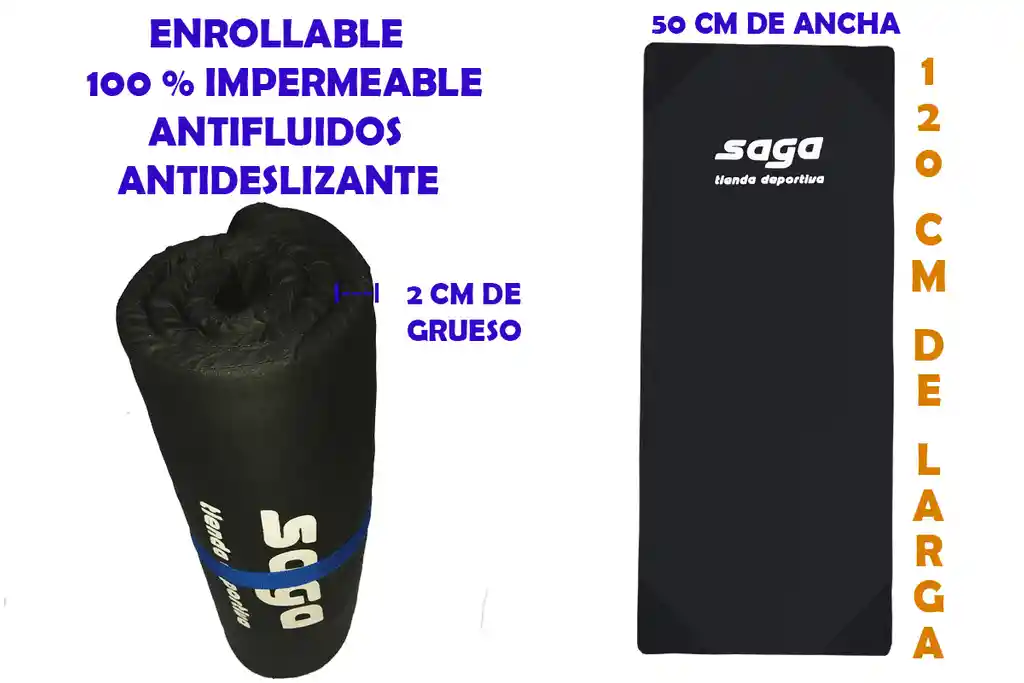 COLCHONETA ENROLLABLE PROFESIONAL. EJERCICIO YOGA , GIMNASIO. IMPERMEABLE, ANTIFLUIDOS Y ANTIDESLIZANTE. CON CREMALLERA. SI DESEAS COMPRAR MÁS DE UNA COLCHONETA TE ECOMENDAMOS MIRAR EN NUESTRAS OTRAS PUBLICACIONES LA QUE CORRESPONDE A DOS UNIDADES. DE ESTA FORMA TE SALE MÁS ECONÓMICO EL ENVÍO. SOMOS SAGA TIENDA DEPORTIVA. 6 MESES DE GARANTÍA. SOMOS FABRICANTES. TE GARANTIZAMOS LA MEJOR CALIDAD Y EL MEJOR PRECIO DEL MERCADO. Descripción: Diseñada tanto para hombres y mujeres que realizan rutinas de ejercicios ya sea en su casa o gimnasio. Fabricada con materia prima nacional CERTIFICADA de excelente calidad. Espuma de polietileno. de adecuada densidad con celdas cerradas. Está Forrada en Poliéster 100 % impermeable, antifluidos y antideslizante muy fácil de limpiar. Reforzada en las 4 esquinas. Un producto muy cómodo. Fácil de transportar y/o guardar por su característica de enrollable. Fabricado por confeccionistas de larga experiencia con la asesoría de expertos en educación física y deportes. Quedarás muy contento con el producto y el servicio. Cómpralo aprovechando el PRECIO DE INTRODUCCIÓN. SOLAMENTE POR ESTA SEMANA. MARCA: SAGA Color disponible: negro Características principales: 1. Medidas: 120 centímetros de larga. 50 cm de ancha. 2 cm de grosor. 2. Aguantan trabajo pesado. 3. No se deslizan con tu sudor, ni con agua. 4. ENROLLABLE. 5. Con cremallera de excelente calidad. 6. Doble costura, con hilo muy resistente. 7. Fabricadas por confeccionistas expertos. 8. Reforzada en las 4 esquinas. 9. Diseño Versátil y elegante. 10. 6 meses de garantía en la costura. 11. Fácil de transportar o de guardar. 12. Viene con su correa cosida al forro para mayor seguridad. Beneficios principales: 1. Ayudan a perder peso, quemando grasa y calorías. 2. Tonifican y moldean tu cuerpo. 3. Ayudan a Conservar tu buena salud. GARANTÍA DE EXCELENTE CALIDAD