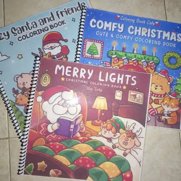 Colección 3 libros para colorear Navidad, cada uno argollado con caratula plastica impreso en papel de 75gr. Libro Para Colorear Merry Lights Navidad Libro Para Colorear Santa and Friends Navidad Libro Para Colorear Comfy Christmas Navidad