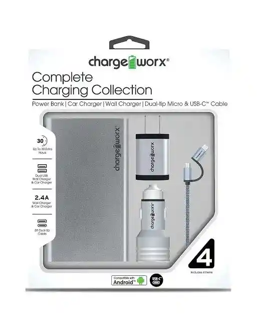 Chargeworx Metallic Colección de carga completa con cable micro USB y USB-C, plateado # De parte del Fabricante: CX6703SL N. ° de pieza de FESCO: CHA-CX6703SL UPC: 643620011751 Paquete maestro: 48 Paquete interior: 6 DESCRIPCIÓN: Hasta 30 horas extra Funciona con todos los dispositivos compatibles con USB Luz indicadora de carga inteligente Carga rápida 2.4A Puertos USB duales Tamaño compacto Funciona con cualquier cable de carga USB Luz indicadora de carga inteligente Carga rápida 2.4A Puertos USB duales Se conecta a cualquier toma de corriente Funciona con cualquier cable de carga USB Cable doble micro y USB-C de 3 pies