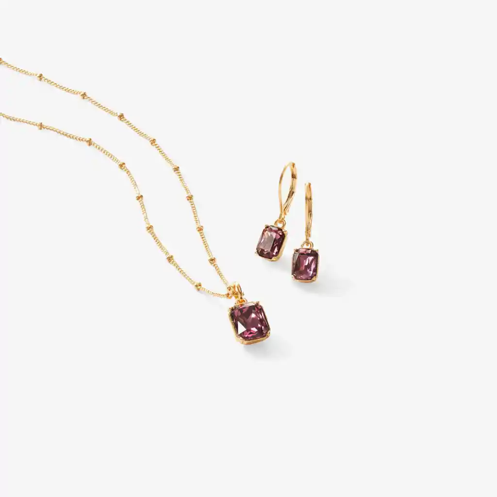 Diseño y Acabado: Cuenta con un baño de oro de 24 quilates en tono amarillo brillante. Detalles: Está decorado con finos cristales en tono morado, lo que le da un toque sofisticado y distintivo. Medidas: El collar tiene un largo aproximado de 43.2 cm, mientras que el dije mide cerca de 1.4 cm. Complementos: Generalmente se vende como parte de un set que incluye aretes a juego (con un largo de aprox. 2.7 cm).