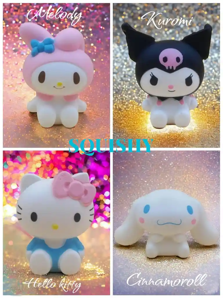 Descripción Colección HELLO KITTY SANRIO! 4 modelos Diferentes de la coleccion SQUISHY KITTY! •Hello kitty •Kuromi •Melody •Cinnamoroll Coleccionalos Todos! Squishy de la más alta calidad, marca SQUISHY coleccionable. Material Super Suave.