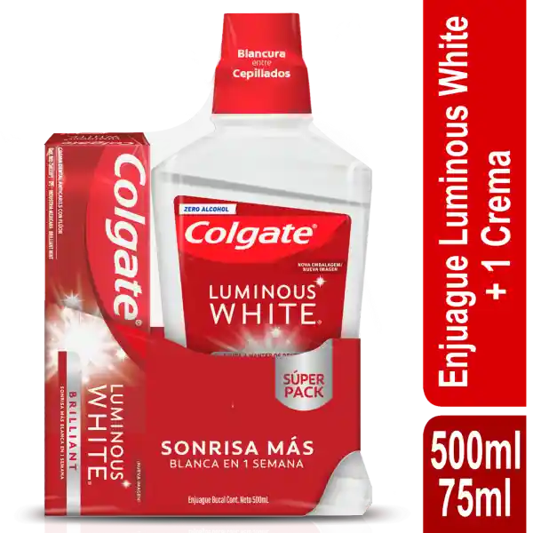 Contiene 2 Unidades. Colgate Enjuague Bucal Luminous White 500 mL + Crema Dental Blanqueadora Colgate Luminous White Brilliant 75 mL. Haz Que tu Sonrisa Sea Más Brillante y Hermosa Utilizando Diariamente el Paquete Blanqueador de Dientes Enjuague Bucal + Crema Dental Colgate Luminous White y Podrás Ver Tus Piezas Dentales Más Blancas Después de Una Semana de Emplearla. La Crema Dental Colgate Contiene Microcristales Aceleradores Que Blanquean Tus Dientes de Forma Segura, Eliminando Las Manchas Ocasionadas Por Bebidas y Alimentos, Evitando la Formación de Sarro en Ellos. El Enjuague Bucal Colgate Luminous White Viene en Una Presentación, Que Elimina Las Bacterias en tu Boca, Brindándole un Aliento Fresco. También Retira Sarro, la Placa y Manchas de Tus Dientes.