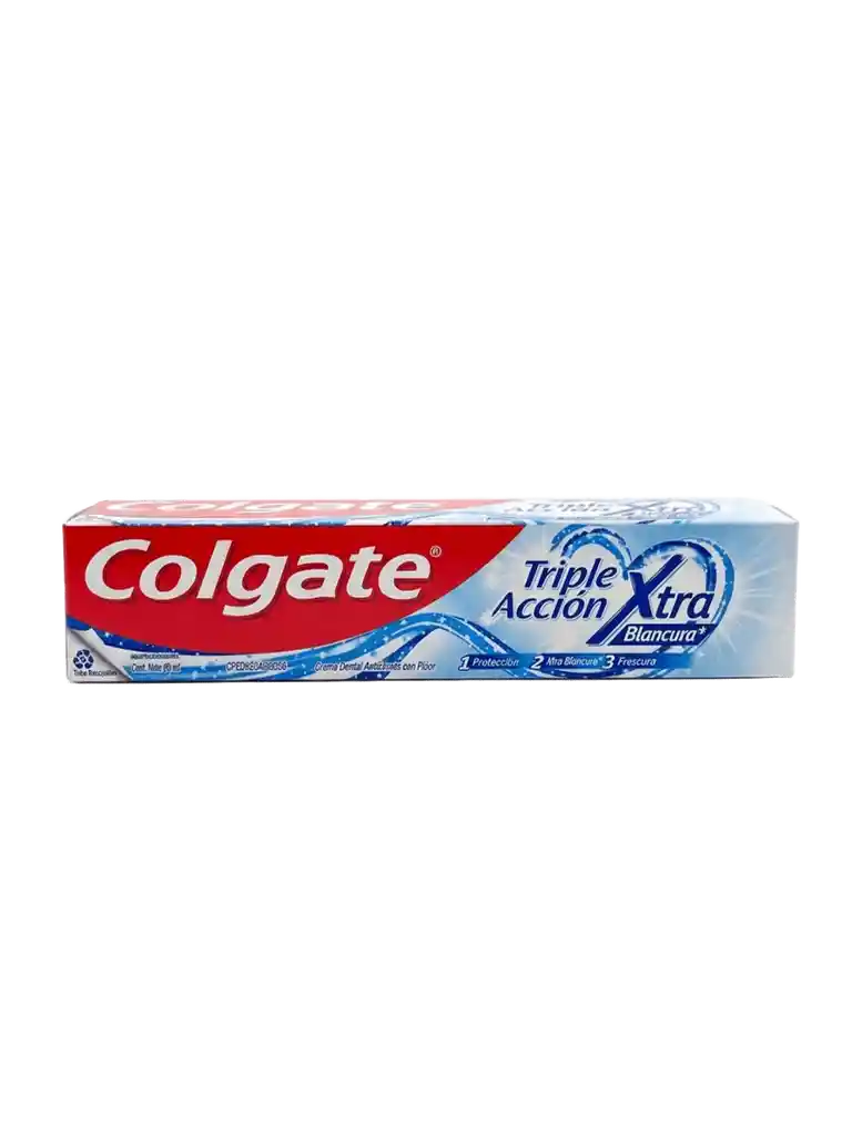 Crema Dental Colgate Triple Acción Xtra Blancura (60 ml). Esta variante avanzada de la línea Triple Acción ofrece un beneficio superior de blanqueamiento gracias a su sistema de limpieza profunda que ayuda a remover manchas superficiales para una sonrisa más blanca y radiante.