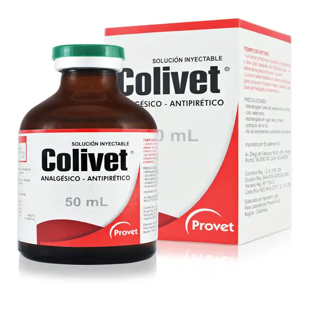 COLIVET COLIVET® es una solución inyectable con acción analgésica, antipirética y antiespasmódica, indicada en todas las especies domésticas. INDICACIONES La acción Analgésica, Antipirética y Antiespasmódica de COLIVET® es efectiva en todos los animales domésticos; controla el dolor agudo y la fiebre producida por: Cólicos, Intervenciones quirúrgicas, afecciones musculo esqueléticas (Miositis, traumatismos), artritis aguda, neuritis, neuralgias. En el lumbago de los caballos, COLIVET® sirve para disminuir las manifestaciones de dolor y angustia. DOSIS Y VÍA DE ADMINISTRACIÓN La dosis básica de la dipirona es 28 mg por kilo cada 8 horas. Bovinos y equinos adultos: 20 a 60 mL Terneros y potros: 5 a 15 mL Porcinos: 10 a 30 mL Ovinos y caprinos: 2 a 8 mL Caninos: 1 a 5 mL En casos agudos es recomendable la aplicación intravenosa. En caso de la inyección intramuscular, la acción se inicia a los 30 minutos. La repetición de la dosis queda a criterio del Médico veterinario.