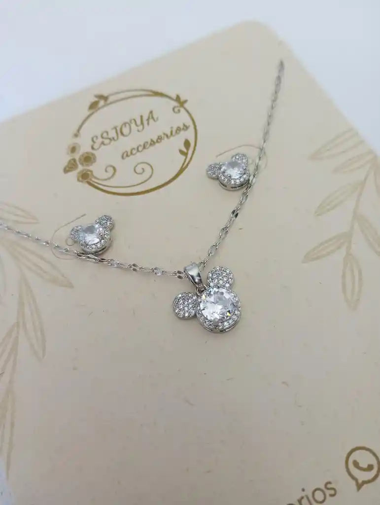 HERMOSO Y ELEGANTE COLLAR + ARETES PLATEADOS MINNIE PARA DAMA B29 ULTIMA COLECCION