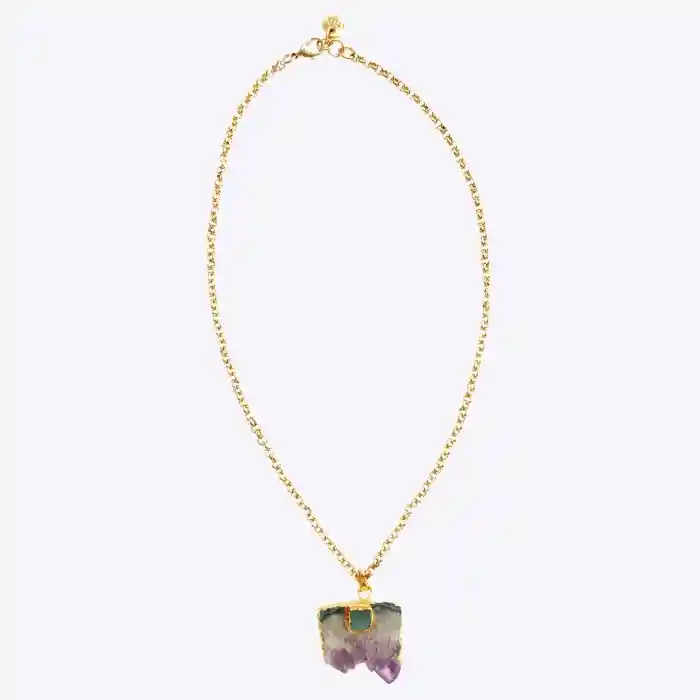 Dije cuarzo irregular amatista con incrustación de mini drusa. Cadena con baño en oro libre de niquel. La imagen del cuarzo es de referencia, ya que por ser una piedra natural cada dije es de tamaño y colores únicos