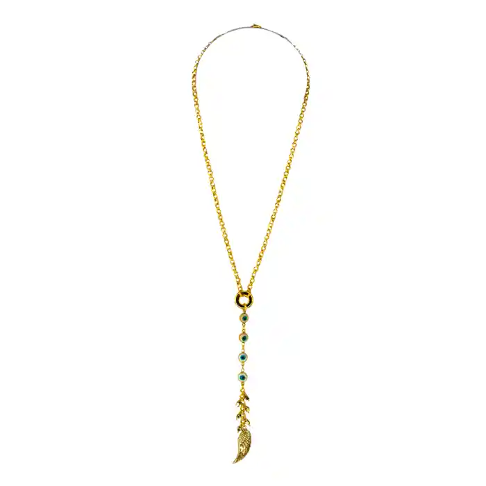 Collar con dije de ala bañado en oro y delicados ojos turcos elaborados en resina. Cadena bañada en oro libre de niquel
