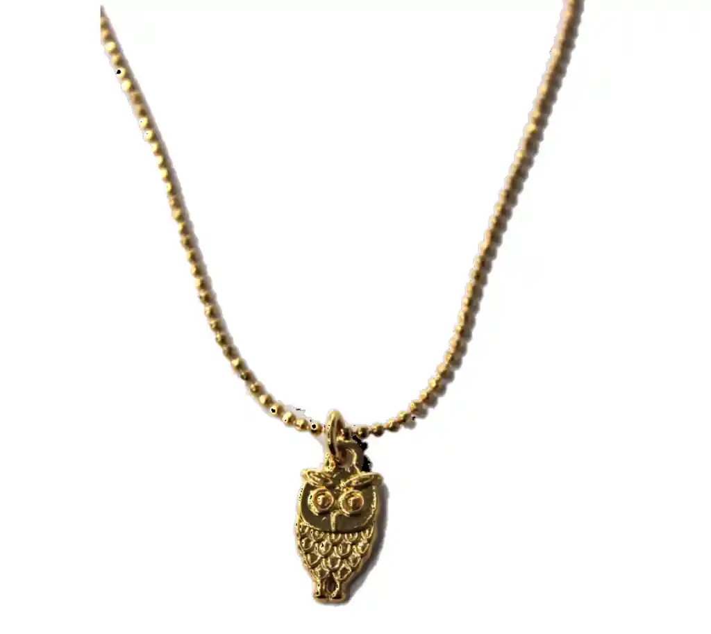 Cadena corta y dije buho, elaborada en bronce con baño en oro, libre de niquel.