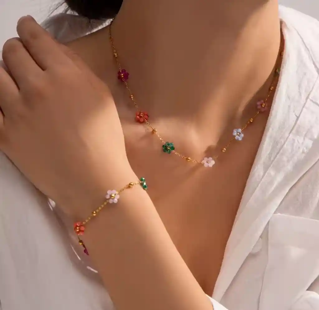 Este hermoso set le da un toque de frescura y alegría a tu look , hecho en acero inoxidable, con diseño delicado. Perfecto para usar todos los días o para complementar tus looks más especiales.