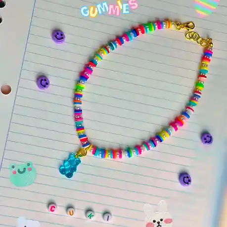 Collar de mostacillas de arcilla polimérica, con dije de osito de gomita, ideal para combinar con cualquier outfit y llenarlo de colores y estilo. Tamaño: 30 cm de diametro con extensor.
