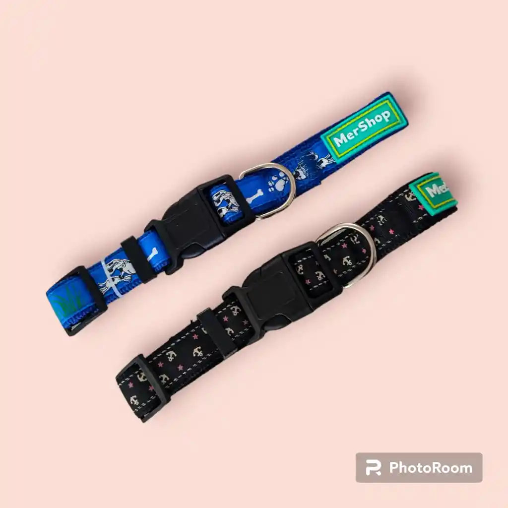Collar en reata plana de 2cm de ancho. Opciones: Colores y pespuntes reflectivos. Cinta estampada de perritos Cinta estampada de anclas. Contorno cuello máximo 45 cm y mínimo 35 cm.