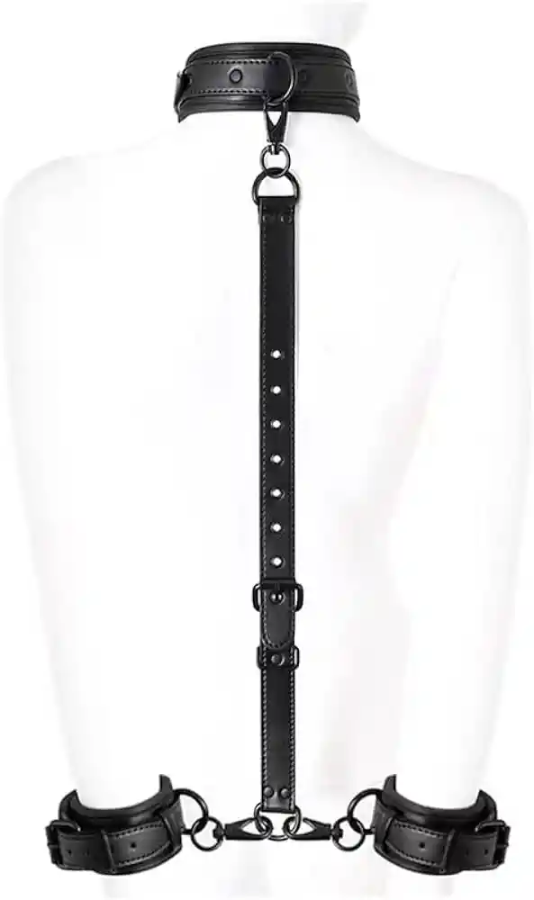 Material: Cuerina sintética (Revés cuero) y otros. Se pone en las muñecas y cuello según el orden del juguete, Se ajusta a preferencia. Este dará unas poses muy excitantes a quien lo use. Usada para el juego intimo en los fetiches BDSM, Dando una experiencia distinta en la intimidad.